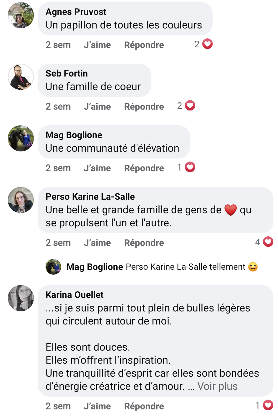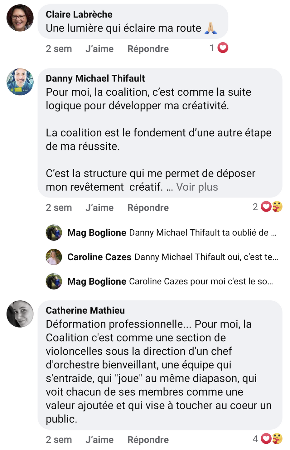 Quelle chance j’ai de pouvoir compter sur du feedback de qualité ! Je l’ai déjà dit dans le groupe et je le redis : j’ai investi des milliers de dollars dans plusieurs formations et j’ai rarement vu autant de qualité d’accompagnement. C’est exceptionnel. Franchement, vous pouvez être fiers ! C’est tellement rassurant de se sentir soutenu, c’est facilitant et je trouve que c’est un gros plus de la Coalition Méta.