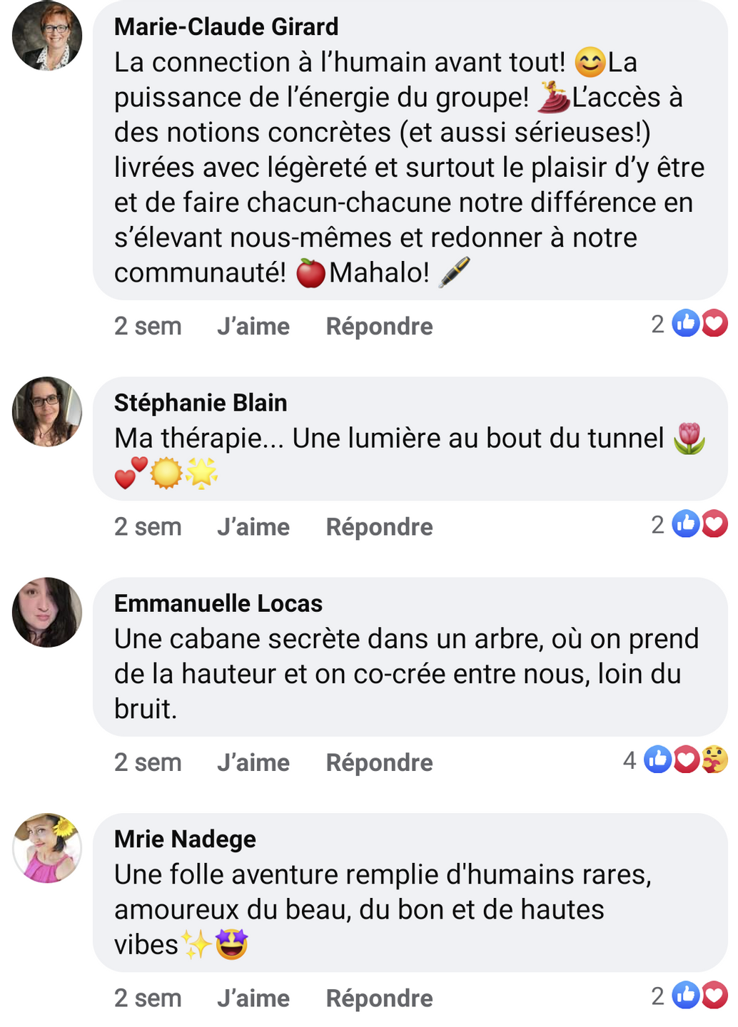 Des moments puissants π surtout jeudi car des obligations m’ont empêché d’être là vendredi, comme je l’aurais souhaité. C’était à la hauteur! Les moments détente/méditation/EFT/danse ont ajouté de la valeur à l’immersion. Merci pour le travail derrière- on a senti que vous y aviez mis de l’amour. Très heureuse de faire partie de cette belle communauté. π