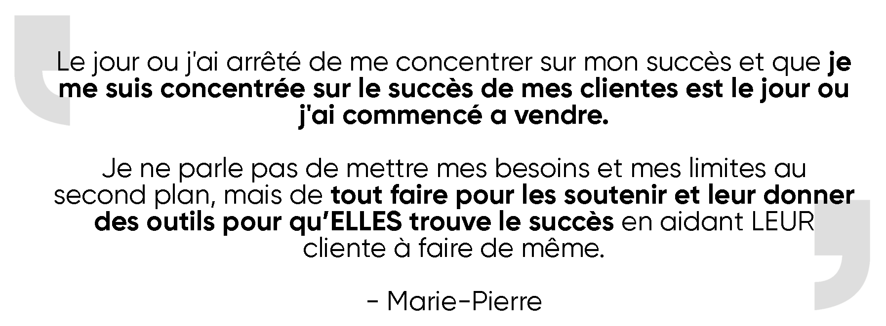 "Marie-Pierre est une femme vraie, sensible et drôle... Quand tu es perdue, que tu vois petit , et que tu crois tourner en rond... sa vision t’amène à prendre un autre envol, à voir grand et à croire que tout est encore possible."